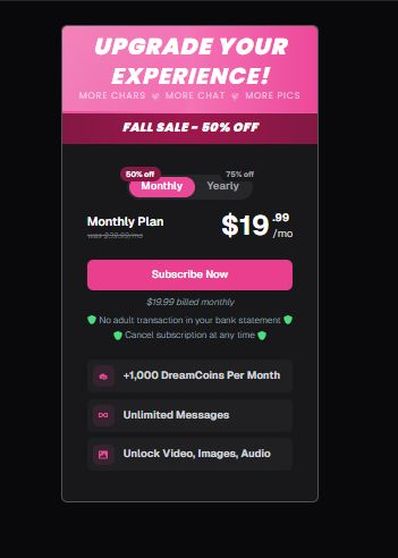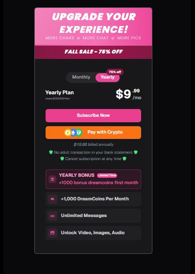 The OurDream AI free trial gives you limited characters and chats, but subscriptions unlock the full suite. Monthly and yearly options exist, with yearly plans being cheaper overall. Tokens can also be bought for extra image and NSFW perks.